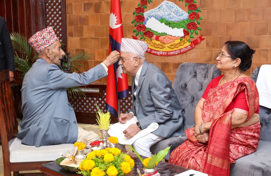 काठमाडौं । प्रधानमन्त्री केपी शर्मा ओलीले विजयादशमीको टीका ग्रहण गरेका छन् । उनले बुबा मोहनप्रसाद ओलीको हातबाट टीका ग्रहण गरेका हुन् ।