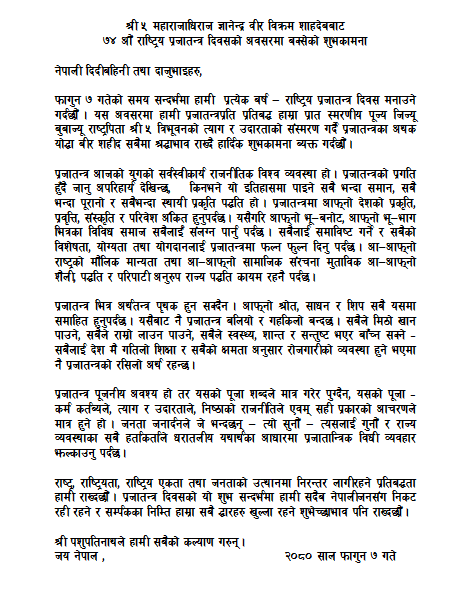 ‘प्रजातन्त्र पूजनीय अवश्य हो तर यसको पूजा शब्दले मात्र गरेर पुग्दैन, यसको पूजा–कर्म कर्तब्यले, त्याग र उदारताले, निष्ठाको राजनीतिले एवम्सही प्रकारको आचरणले मात्र हुने हो । जनता जनार्दनले जे भन्दछन्, त्यो सुनौं– त्यसलाई गुनौं र राज्य व्यवस्थाका सबै हर्ताकर्ताले धरातलीय यथार्थका आधारमा प्रजातान्त्रिक विधी व्यवहार झल्काउनु पर्दछ’, उनले भनेका छन् ।