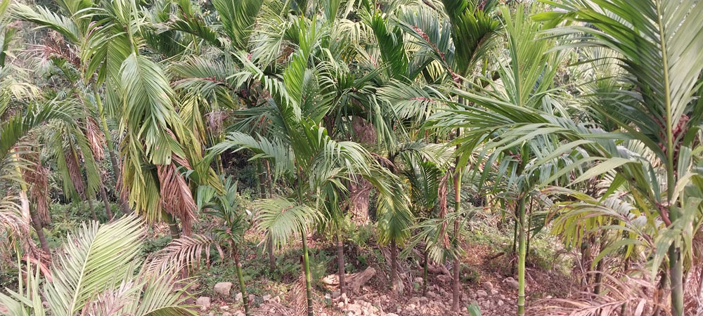 इलाम । इलामको माई नगरपालिका–९ चिसापानीका किसान श्रीमान् राईले करिब ५० रोपनी जग्गामा सुपारी खेती गर्नुभएको छ । उनको सुपारी बगानमा पाँच हजार बोट छन् । ‘केहीमा फल लागेको छभने केही फल्ने अवस्थामा छन’, उनले भने, ‘व्यापारी बगानमा नै आएर खरिद गर्ने भएकाले बजारको चिन्ता छैन । काँचो सुपारी बगानबाटै प्रतिकिलो रु ५० का दरले बिक्ने गरेको छ ।’