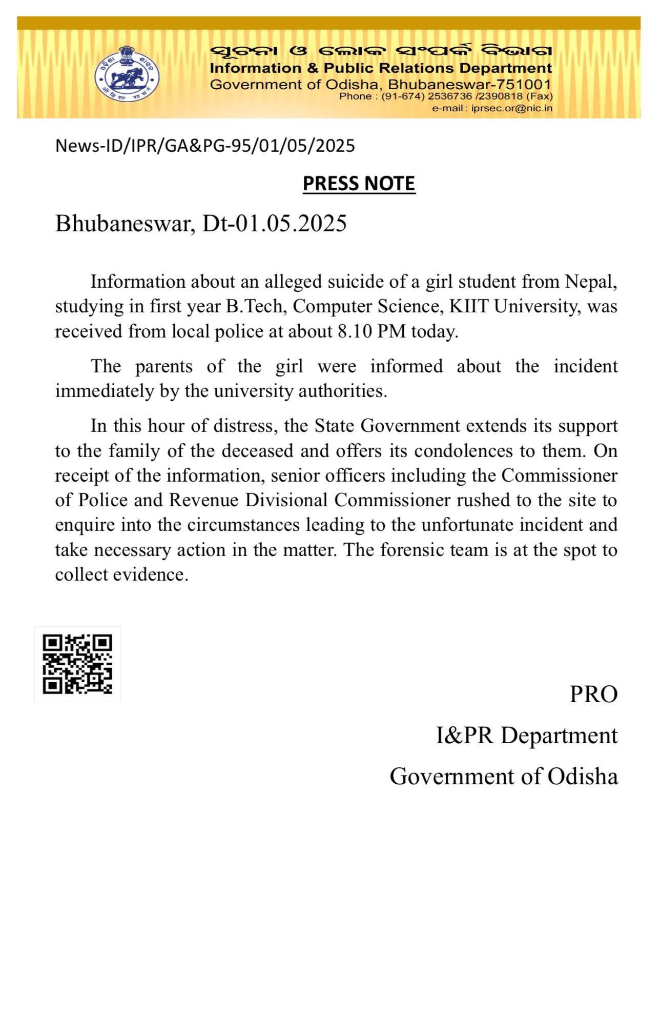 भारतको ओडिसा सरकारले कालिङ्गा इन्स्टिच्युट अफ इन्डस्ट्रियल टेक्नोलोजीमा नेपाली छात्रा मृत भेटिएको घटनामा दुःख व्यक्त गर्दै छानबिनको आदेश दिएको हो ।