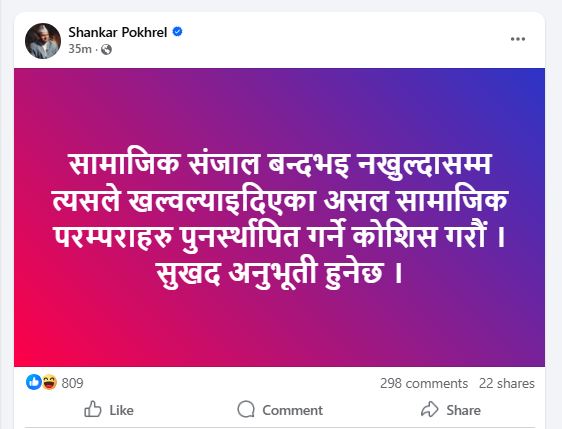 ‘सामाजिक संजाल बन्द भइ नखुल्दासम्म त्यसले खलबल्याइदिएका असल सामाजिक परम्पराहरू पुनर्स्थापित गर्ने कोसिस गरौँ’, उनले केहीबेरअघि सामाजिक सञ्जालमा लेखेका छन्।
