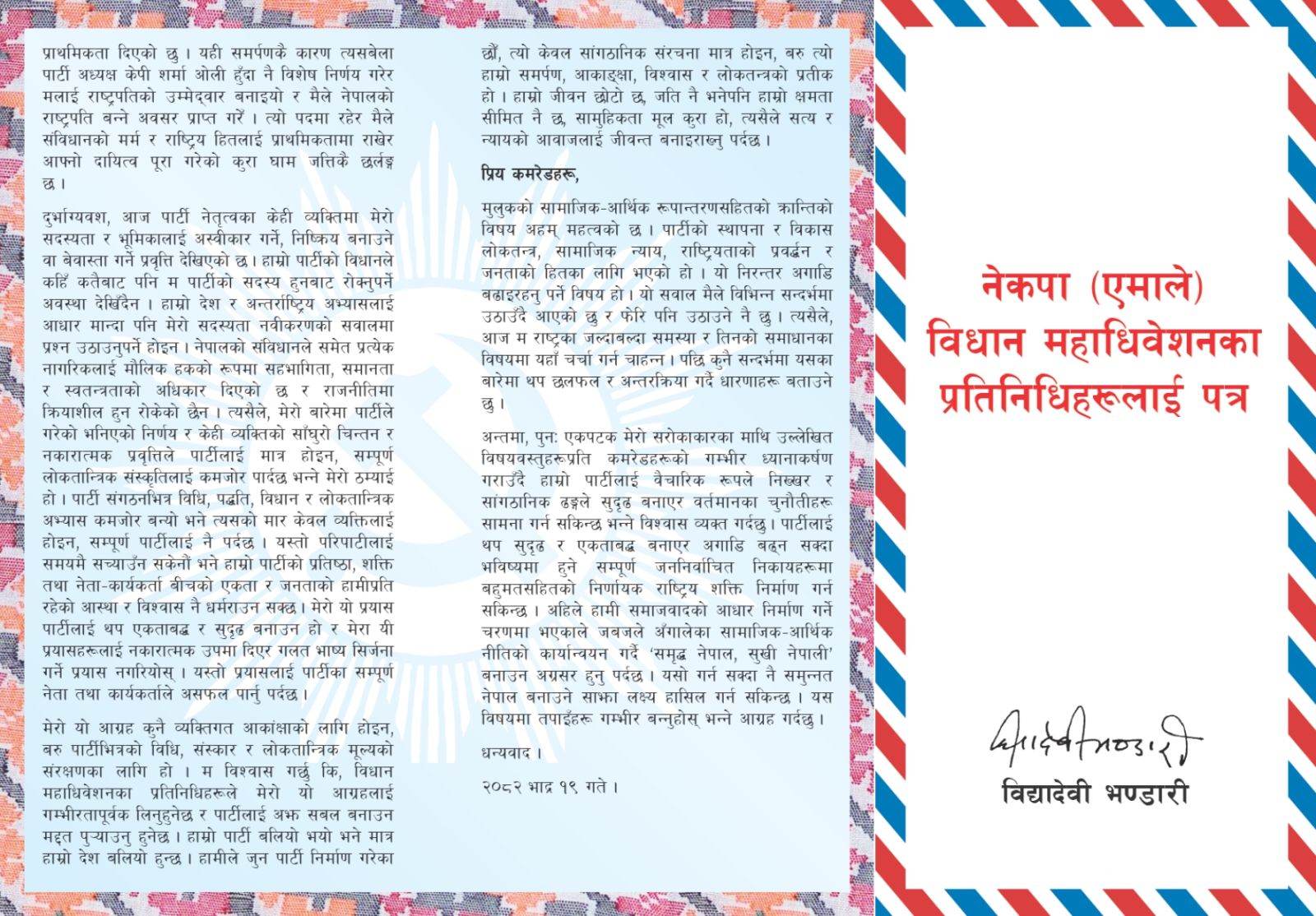 काठमाडाैं। पूर्वराष्ट्रपति विद्यादेवी भण्डारीले सत्य र न्यायको पक्षमा आवाज उठाउन अपिल सहित नेकपा (एमाले) को विधान महाधिवेशन प्रतिनिधिलाई पत्र लेखेकी छिन् ।