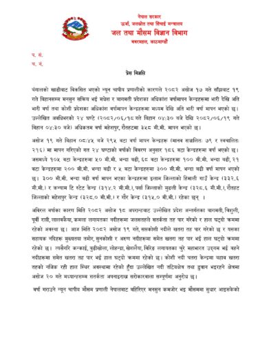 विभागका अनुसार तर मनसुन बहिरगमन भइ नसकेकाले अझै केही दिन रहने छ। विभागले आज एक विज्ञप्ति जारी गर्दै असोज २० गते अपरान्हसँग नदी आसपासका क्षेत्रमा जोखिम कायमै रहेको जनाएको छ।