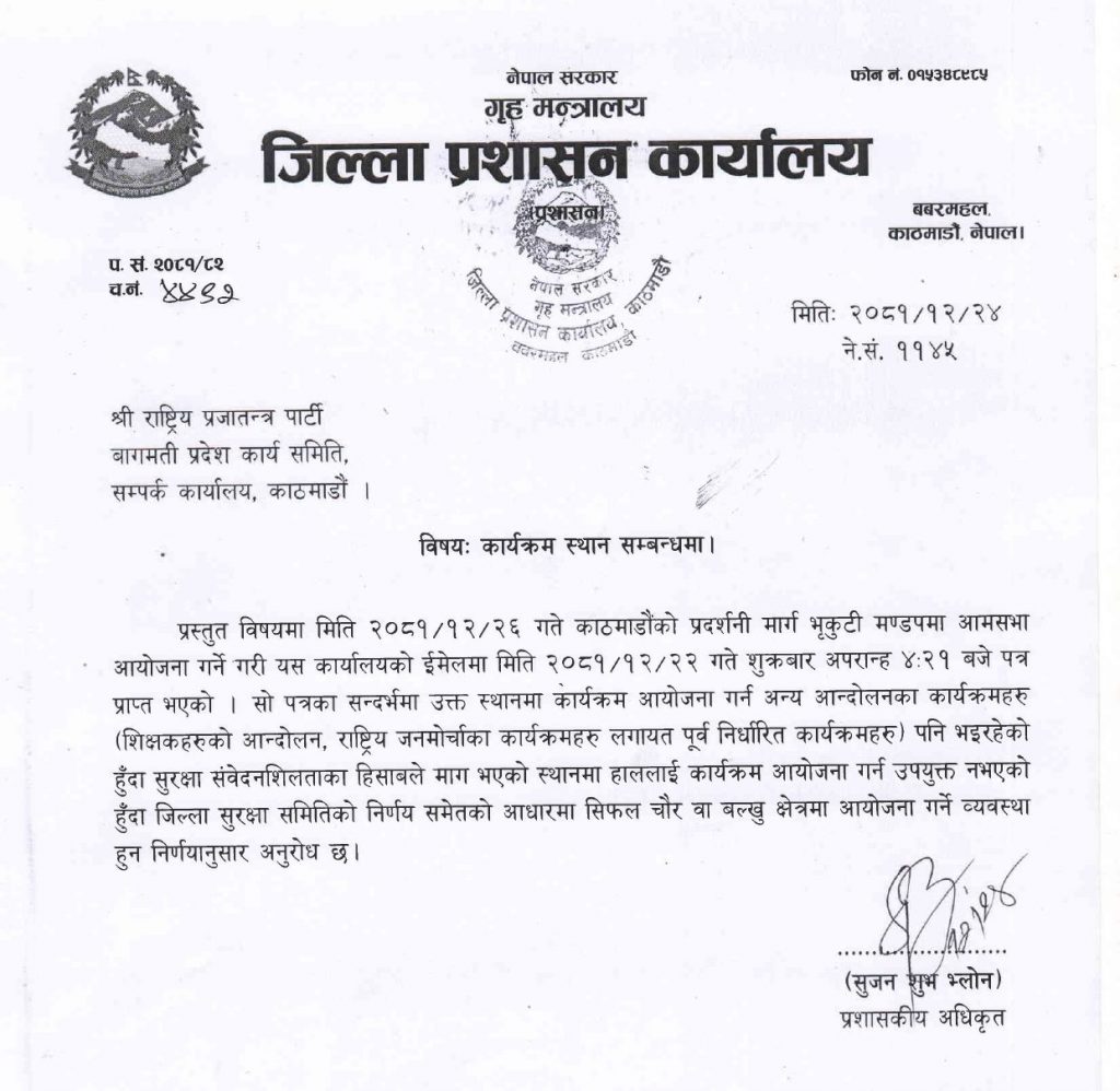 काठमाडौं । जिल्ला प्रशासन कार्यालय, काठमाडौंले राष्ट्रिय प्रजातन्त्र पार्टी (राप्रपा)लाई आगामी चैत २६ गते भृकुटीमण्डपमा आयोजना गर्न चाहेको आमसभा गर्न नदिने निर्णय गरेको छ।