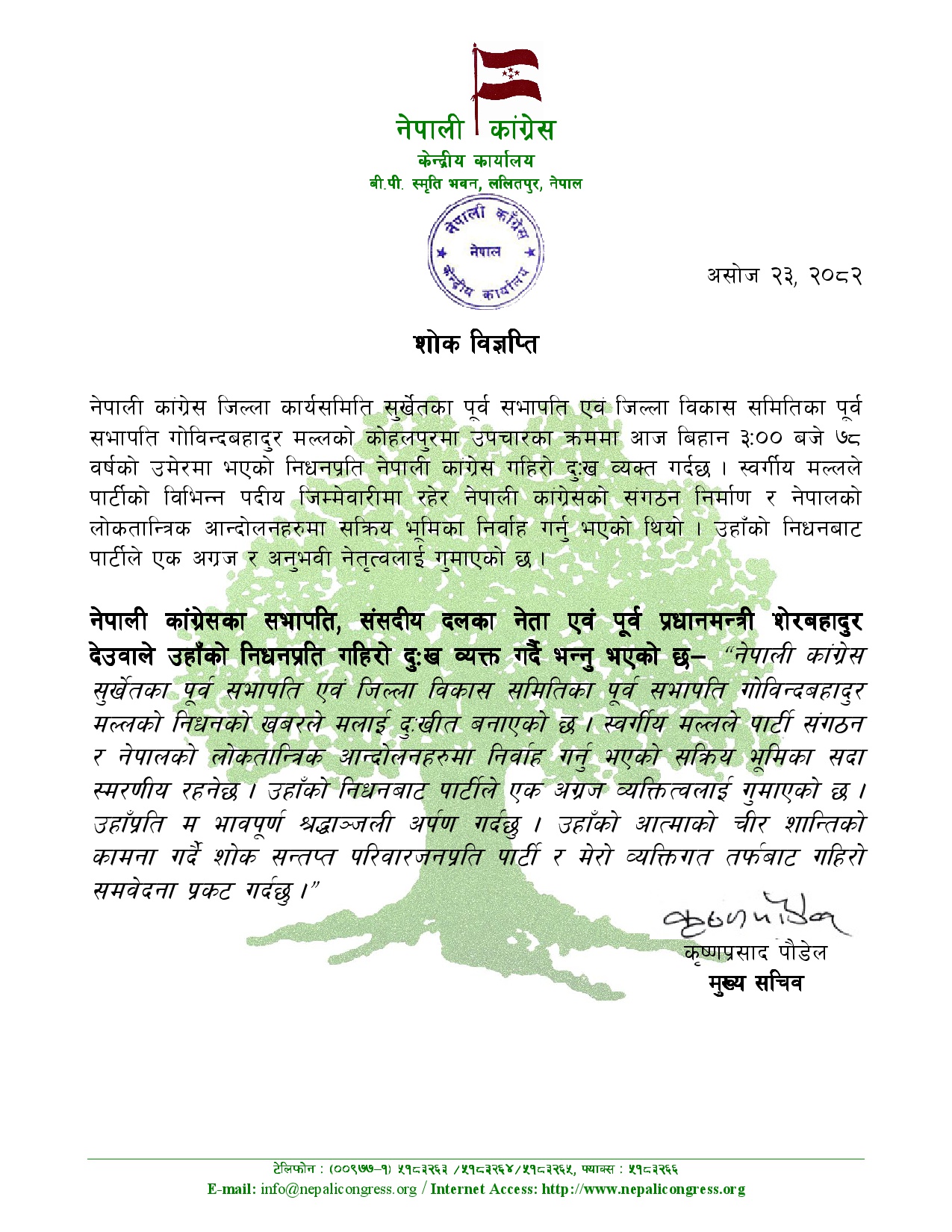 काठमाडौँ । नेपाली काँग्रेसले पार्टी सुर्खेतका पूर्वसभापति गोविन्दबहादुर मल्लको निधनप्रति गहिरो दुःख व्यक्त गरेको छ ।