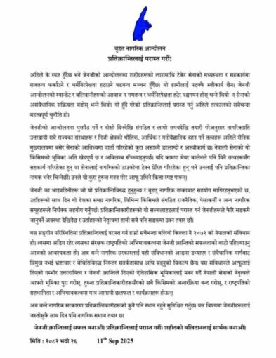 संविधानले आफूलाई दिएको गम्भीर उत्तरदायित्व र जेन–जी क्रान्तिले दिएको ऐतिहासिक भूमिकालाई मनन् गर्दै सैनिक नेतृत्वले आफ्नो भूमिका पूरा गर्नुपर्ने नागरिक आन्दोलनको भनाइ छ ।