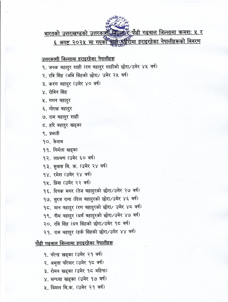 दिल्लीमा रहेको नेपाली दूतावासका अनुसार उत्तरकाशीको धरालीमा २१ र पौडीगढवालको बंकुरामा पाँच गरी २६ जना बेपत्ता छन् ।