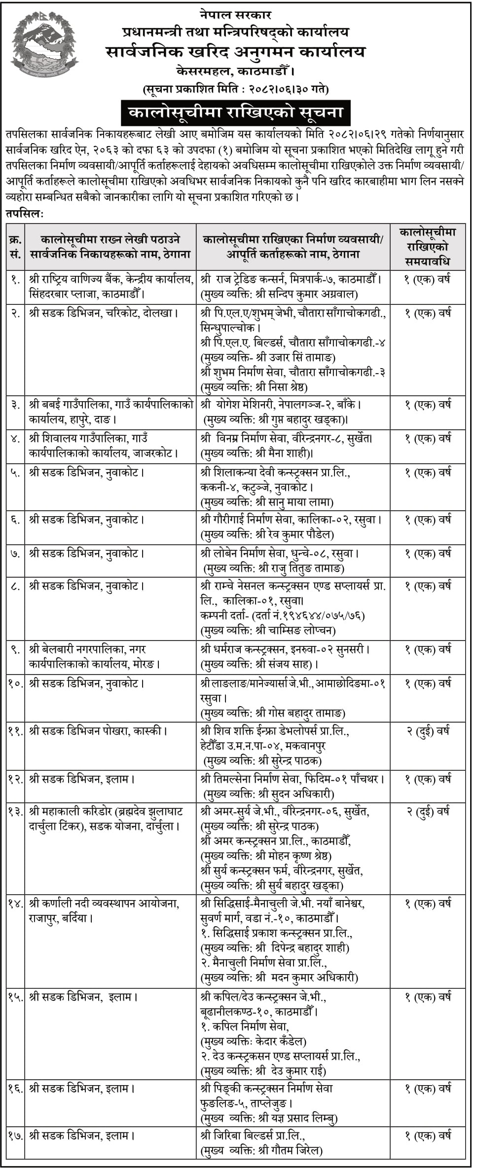 प्रधानमन्त्री तथा मन्त्रिपरिषद्को कार्यालयअन्तर्गतको सार्वजनिक खरिद अनुगमन कार्यालयले बिहीबार सूचना प्रकाशित गर्दै ती कम्पनीहरूलाई एकदेखि दुई वर्षसम्मका लागि कालोसूचीमा राखेको हो ।