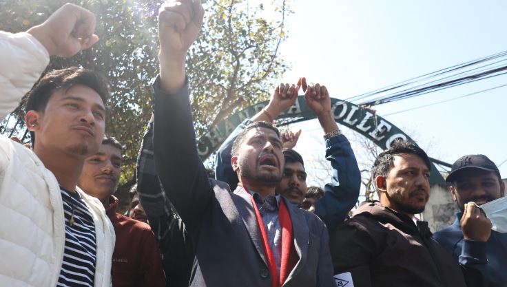 त्रिचन्द्र बहुमुखी क्याम्पसमा एमाले निकट अनेरास्ववियुले प्रदर्शन गरेको छ । स्वतन्त्र उम्मेदवारी दिएका नेविसंघका बागी उम्मेदवार विवेक बानियाले आइतबार राति विभिन्न माग राख्दै तालाबन्दी गरेपछि ‘ताला संघ, चुनाव हुनदेउ’ भन्दै क्याम्पसमा एमाले निकट अनेरास्ववियुले प्रदर्शन गरेको हो । आगामी चैत ५ गते अर्थात भोली स्वतन्त्र विद्यार्थी युनियन (स्ववियु) निर्वाचन हुदैँछ । तर, अहिले निर्वाचनको पूर्वसन्ध्यामा आइपुग्दा विद्यार्थी संगठनहरू तालाबन्दी गर्ने, तोडफोड गर्ने तथा निर्वाचन बिथोल्ने गतिविधिमा लागेका छन् ।