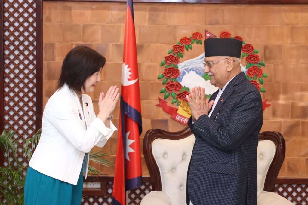 काठमाडौं– प्रधानमन्त्री केपी शर्मा ओलीसँग सगरमाथा संवादका लागि नेपालमा रहेकी जापानकी परराष्ट्र उपमन्त्री इक्युना आकिकोले आज शिष्टाचार भेट गरेकी छन् ।