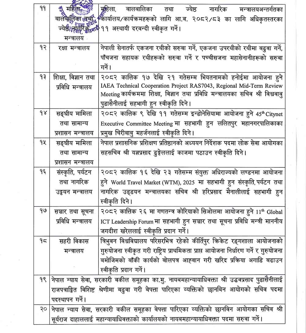 मन्त्रिपरिषद्को बैठकले तत्कालीन प्रधानमन्त्री केपी शर्मा ओली नेतृत्वको सरकारले नियुक्त गरेका ११ देशका राजदूतलाई फिर्ता बोलाउने, त्रिभुवन विश्वविद्यालय (त्रिवि) परिसर कीर्तिपुरमा अन्तर्राष्ट्रिय स्तरको क्रिकेट रङ्गशाला निर्माणका लागि गुरुयोजना स्वीकृत गर्ने लगायतका २० निर्णय गरेको छ ।