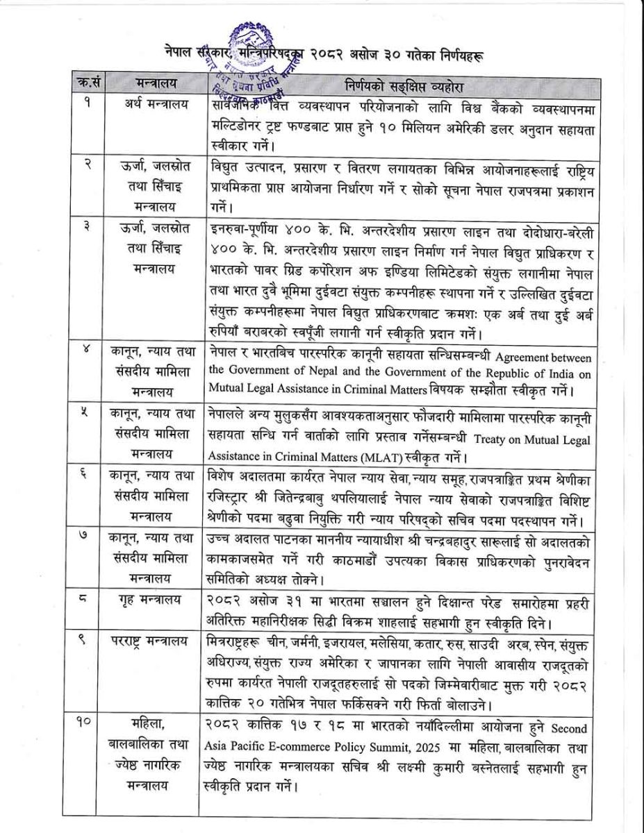 काठमाडौँ । असोज ३० गते बसेको मन्त्रिपरिषद्को बैठकका निर्णयहरु सार्बजनिक गरिएको छ ।