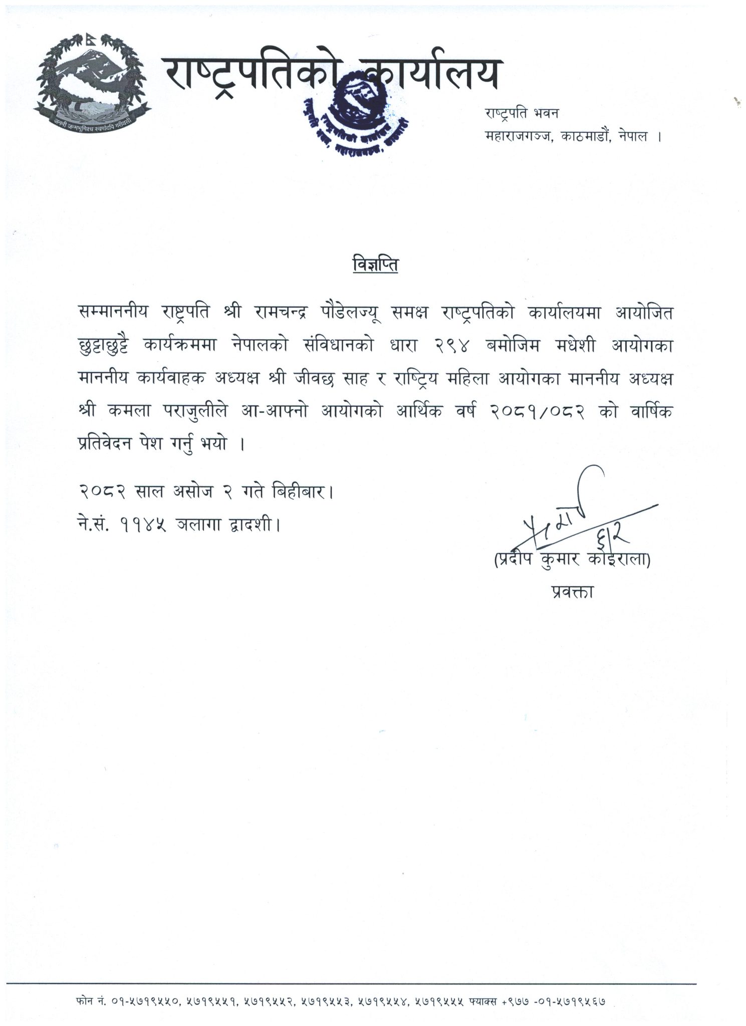 राष्ट्रपतिको कार्यालयमा आज आयोजित छुट्टाछुट्टै कार्यक्रममा नेपालको संविधानको धारा २९४ बमोजिम ती दुई आयोगले आ–आफ्नो आयोगको प्रतिवेदन पेश गरेको प्रवक्ता प्रदीपकुमार कोइरालाद्वारा आज जारी विज्ञप्तिमा उल्लेख छ ।