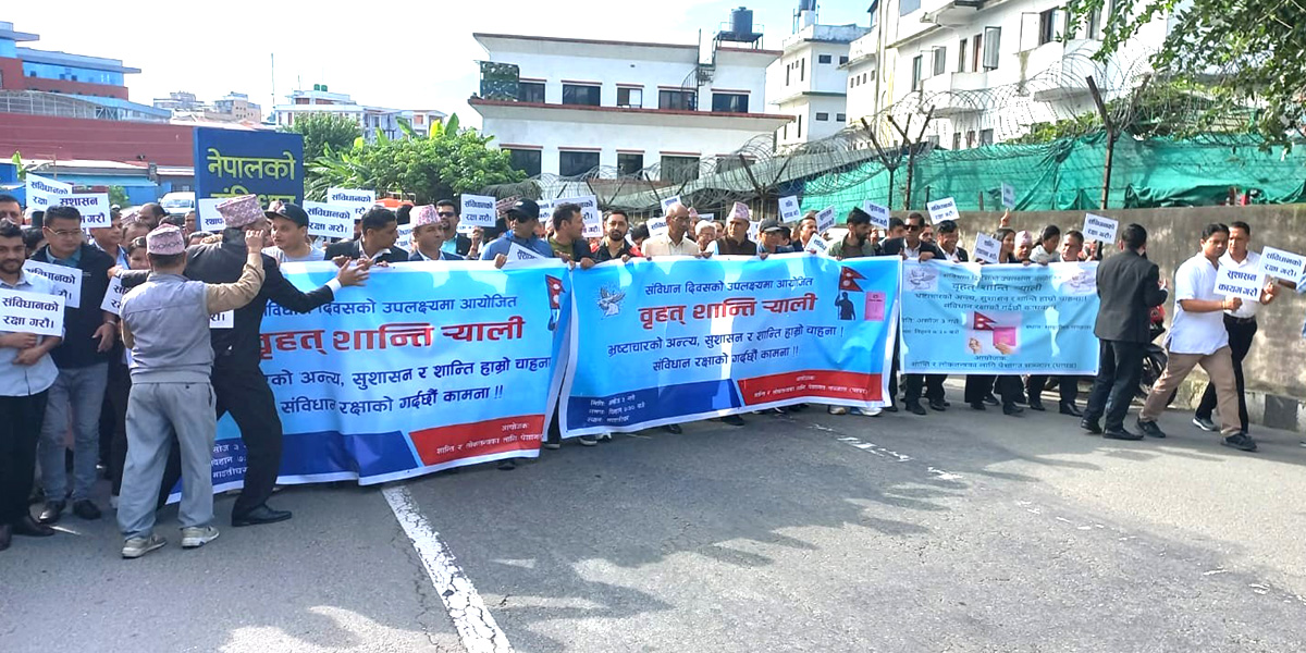 काठमाडौँ। संविधान दिवसका अवसरमा आज बिहान बृहत शान्ति र्यालीको आयोजना गरिएको छ । काठमाडौँको माइतीघरबाट सुरु भएको शान्ति र्याली भद्रकाली, सहिदद्वार, त्रिपुरेश्वर, थापाथली हुँदै पुनः माइतीघर पुगेर सभामा परिणत भएको थियो ।