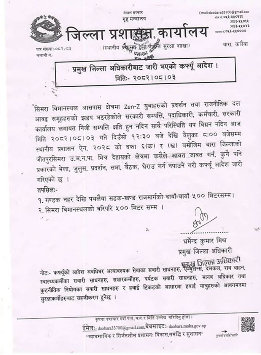 बारा । बाराको सिमरा विमानस्थल आसपासको क्षेत्रमा कर्फ्यू आदेश जारी गरिएको छ ।