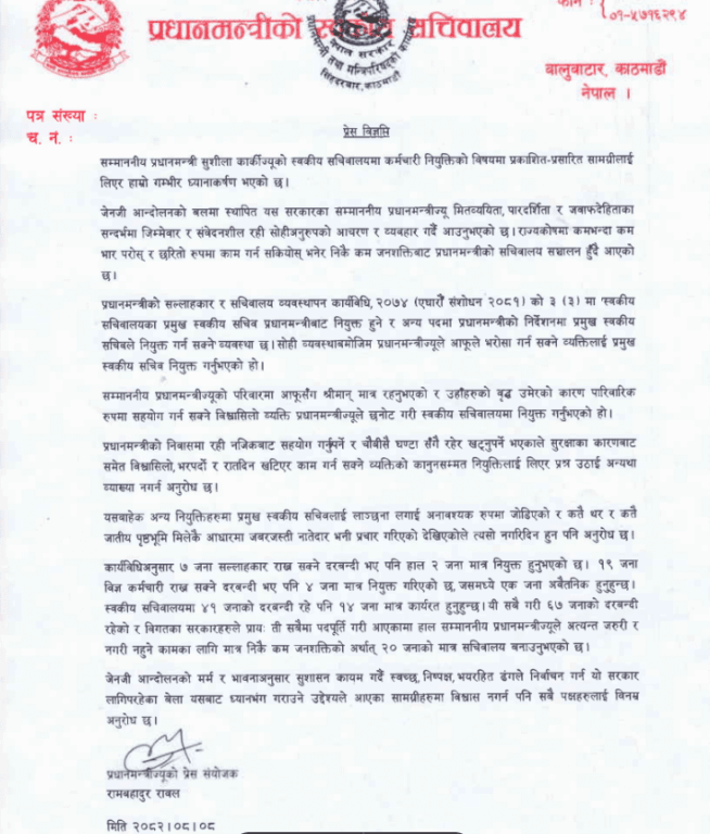 प्रधानमन्त्री कार्कीका प्रमुख स्वकीय सचिव श्रेष्ठले सचिवालयमा आफ्ना मान्छेलाई नियुक्त गरेको भनेर आलोचना भएपछि प्रधानमन्त्रीको सचिवालयले त्यस्ता सामग्रीप्रति आफ्नो गम्भीर ध्यानाकर्षण भएको जनाएको हो। प्रधानमन्त्रीका प्रेस संयोजक राम रावलले सोमबार विज्ञप्ति जारी गर्दै जेनजी आन्दोलनको बलमा स्थापित सरकारका प्रधानमन्त्री मितव्ययिता, पारदर्शिता र जबाफदेहीताका सन्दर्भमा जिम्मेवार र संवेदनशील रही सोही अनुरूपको आचरण र व्यवहार गर्दै आएको उल्लेख गरेका छन् ।