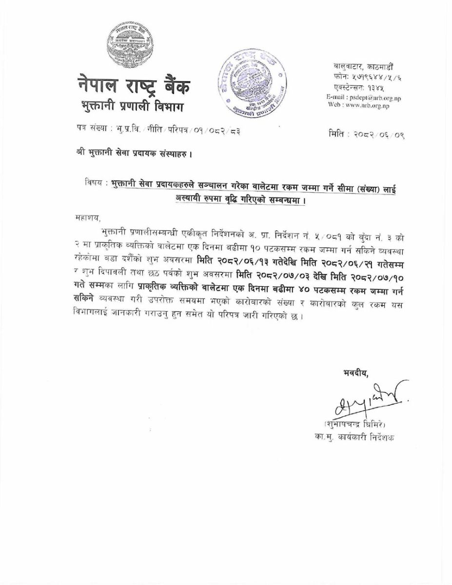 राष्ट्र बैंकको भुक्तानी प्रणाली विभागले हालको प्रावधानअनुसार व्यक्तिगत खातामा एक दिनमा बढीमा १० पटकसम्म जम्मा गर्न सकिने व्यवस्थालाई बढाएर एक दिनमा ४० पटकसम्म रकम जम्मा गर्न सकिने व्यवस्था गरेको जानकारी दिएको छ ।