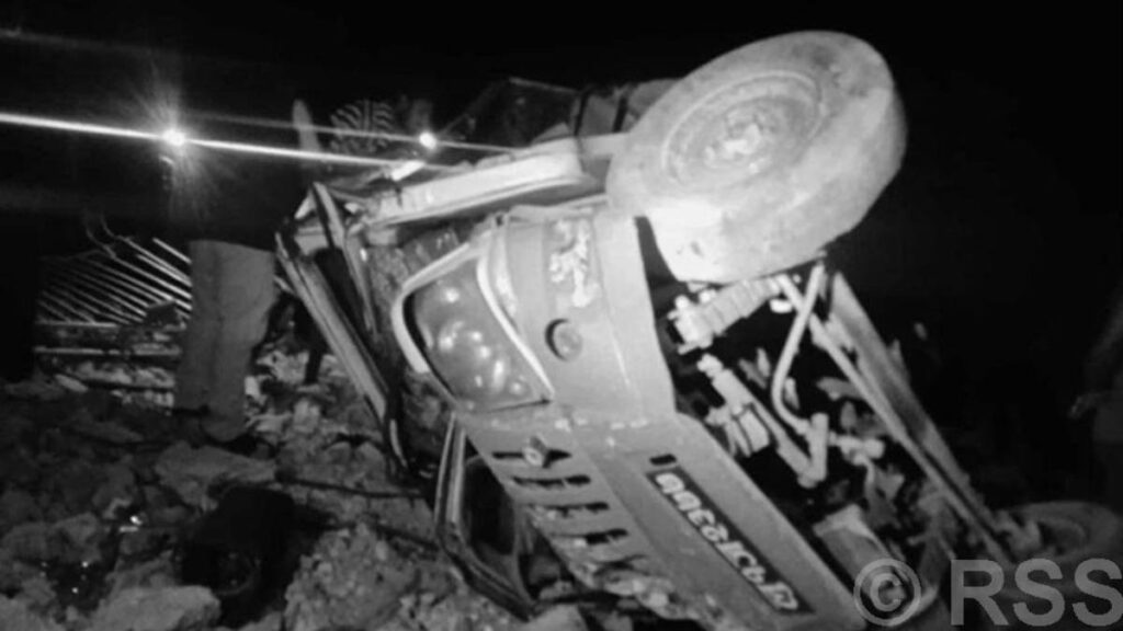 तानसेन (पाल्पा)। रैनादेवी छहरा गाउँपालिका–१ सिद्धेश्वरमा गए राति जिप दुर्घटना हुँदा तीन जनाको मृत्यु भएको छ भने दुई जना घाइते भएका छन् । लु१ज २३७७ नम्बरको जिप सिद्धेश्वरको असारेबाट ठूलापोखरातर्फ जाने क्रममा सर्वाेत्तम सिमेन्ट खानी नजिकै दुर्घटना भएको जिल्ला प्रहरी कार्यालयका प्रहरी नायब उपरीक्षक सुनिल मल्लले जानकारी दिए।