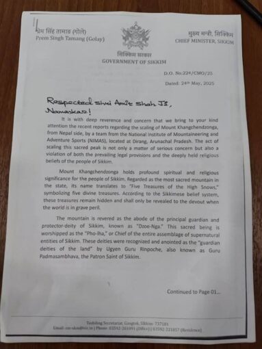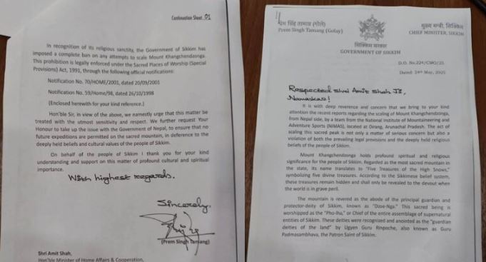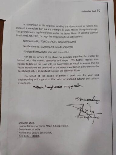 सिक्कमका मुख्यमन्त्री प्रेम सिंह गोलेद्वारा कञ्चनजङ्घा आरोहण प्रयासको विरोधमा गृहमन्त्री अमित शाहलाई पत्र