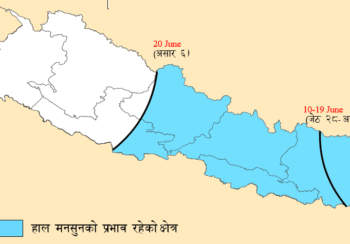 काठमाडौँ। बङ्गालको खाडीबाट जलवाष्पयुक्त हावाको प्रभाव बढेसँगै मुलुकका केही भागमा मनसुन केही सक्रिय भएको छ । जल तथा मौसम विज्ञान पूर्वानुमान महाशाखाले हाल मनसुन न्यूनचापीय रेखाको सरदर स्थानको आसपासमा अवस्थित रहेको जनाएको छ ।