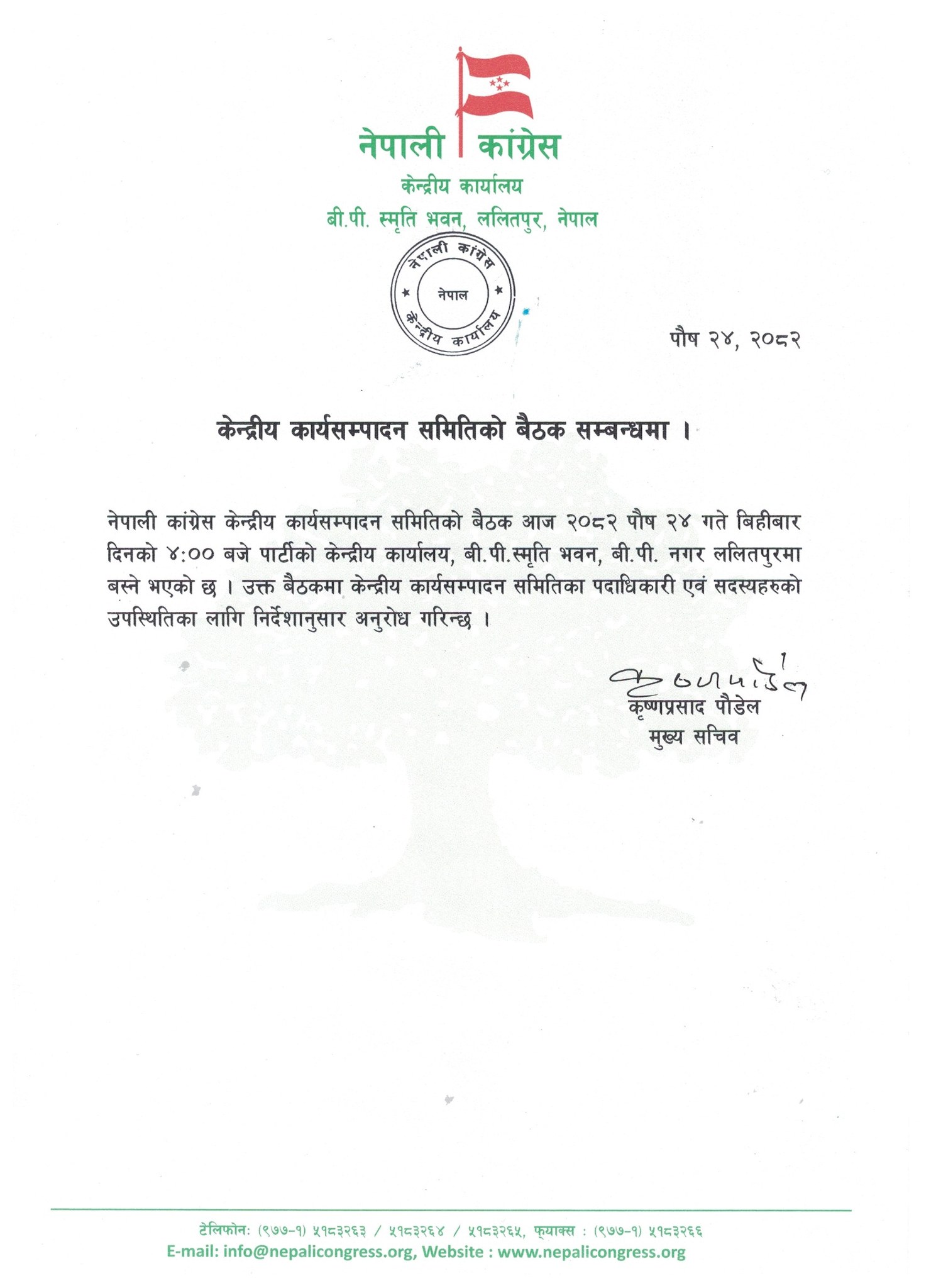 कांग्रेसका मुख्यसचिव कृष्णप्रसाद पौडेलका अनुसार बैठक बिहीबार अपराह्न ४ बजे पार्टीको केन्द्रीय कार्यालयमा बस्नेछ ।