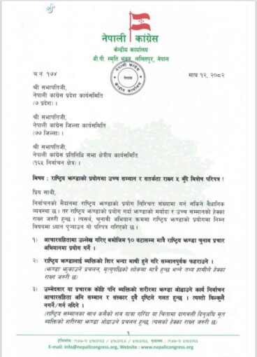 कांग्रेस केन्द्रीय कार्यालयले आइतबार प्रदेश, जिल्ला तथा प्रतिनिधिसभा क्षेत्रीय कार्यसमितिलाई परिपत्र जारी गर्दै राष्ट्रिय झण्डाको प्रयोग मर्यादित, सम्मानजनक र कानुनसम्मत हुनुपर्ने स्पष्ट पारेको हो । परिपत्रमा निर्वाचन ऐन र आचारसंहिताअनुसार निश्चित संख्यामा मात्र राष्ट्रिय झण्डा प्रयोग गर्न सकिने उल्लेख गरिएको छ । परिपत्रमा राष्ट्रिय झण्डालाई व्यक्तिको टाउकोभन्दा माथि राखेर सम्मानपूर्वक फहराउनुपर्ने र झण्डा भुइँमा खसाल्ने, ओढाउने वा अपमानजनक ढंगले प्रयोग गर्ने कार्य नगर्न विशेष जोड दिइएको छ । उम्मेदवार वा प्रचारकले कुनै पनि व्यक्तिको शरीरमा झण्डा ओढाउने कार्य निर्वाचन आचारसंहिता र सम्मान दुवैको दृष्टिले गलत हुने जनाइएको छ ।